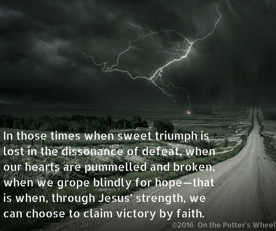 What if that’s the key? In those times when sweet triumph is lost in the dissonance of defeat, when our hearts are pummelled and broken, when we grope blindly for hope—that is when, through Jesus’ strength, we can choose to claim victory by faith. The sweet incense of our offering of faith curls its perfume up to the throne of grace; He inhales deeply, and smiles.